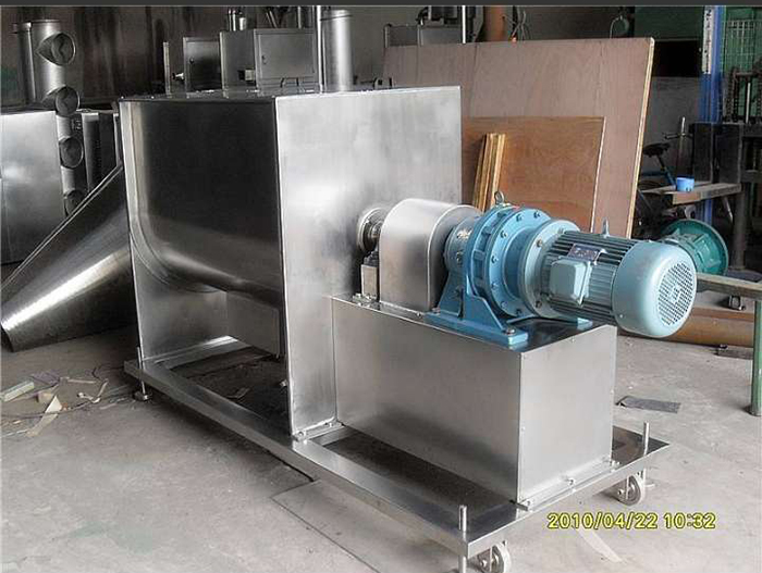 臥式混料機(jī)由U形容器、螺帶攪拌葉片和傳動部件組成;螺帶狀葉片一般做成雙層或三層,外層螺旋將物料從兩側(cè)向中間匯集,內(nèi)層螺旋將物料從中間向兩側(cè)輸送,形成對流混合。 螺帶混合機(jī)對于粘性或有凝聚性的粉粒體的混合以及粉粒體中添加液體及糊狀物料的混合有良好的效果,筒蓋可做成全開式門,以便于對設(shè)備進(jìn)行清洗更換產(chǎn)品。